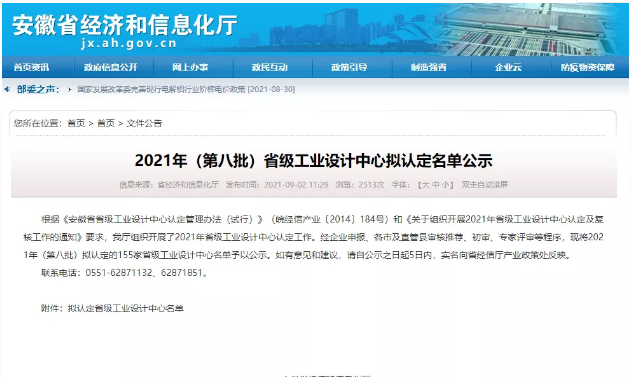 2021年9月6日,安徽省經(jīng)濟(jì)和信息化廳官網(wǎng)公布了2021年(第八批)省級(jí)工業(yè)設(shè)計(jì)中心擬認(rèn)定名單,擬認(rèn)定155家企業(yè)為省級(jí)工業(yè)設(shè)計(jì)中心,安徽蘇立科技股份有限公司工業(yè)設(shè)計(jì)中心榮列其中。